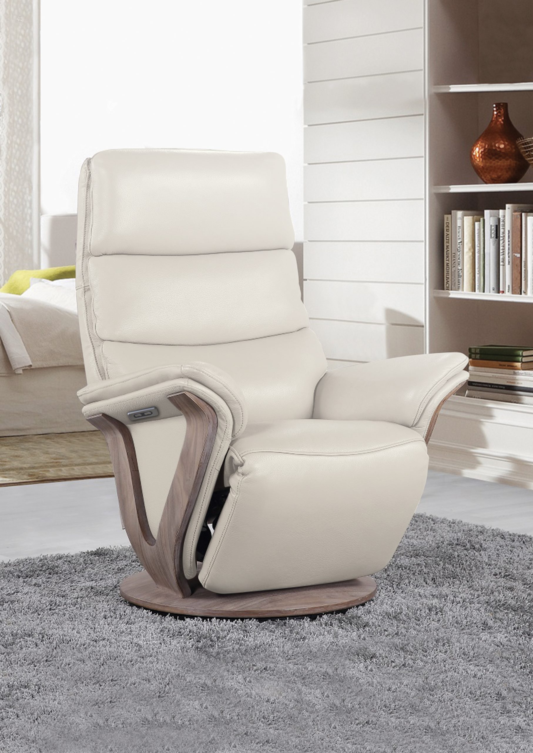 Mécanisme : Système électrique bi-moteur (dossier et repose-pieds indépendants). Inclinaison de 100° à 155°. Base tournante à 360°.